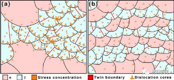 图17拉伸变形过程中双相微观组织演变示意图:(a) AFSW, (b) SFSW。