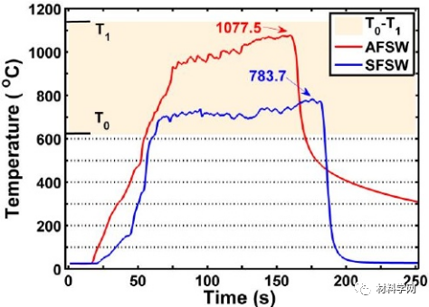 图2空气和水冷却条件下搅拌摩擦焊的热历史分布图。注:T0- t1 表示SAF2507 SDSSs在铁素体和奥氏体之间的相变温度范围,用Jmatpro计算为627℃和1140℃。