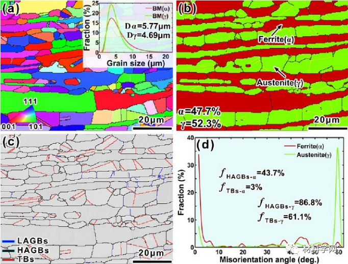 图5接收后BM的EBSD结果:(a)反孔图(IPF), (b)相图,(c)晶界图,(d) α相和γ相对应的定向角分布。