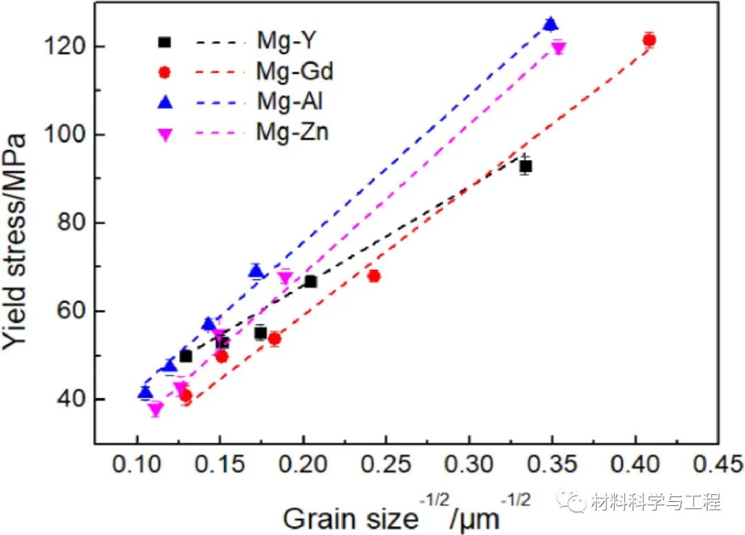 图2 Mg-Y、Mg-Gd、Mg-Al和Mg-Zn合金在压缩过程中的屈服应力与晶粒尺寸的关系。