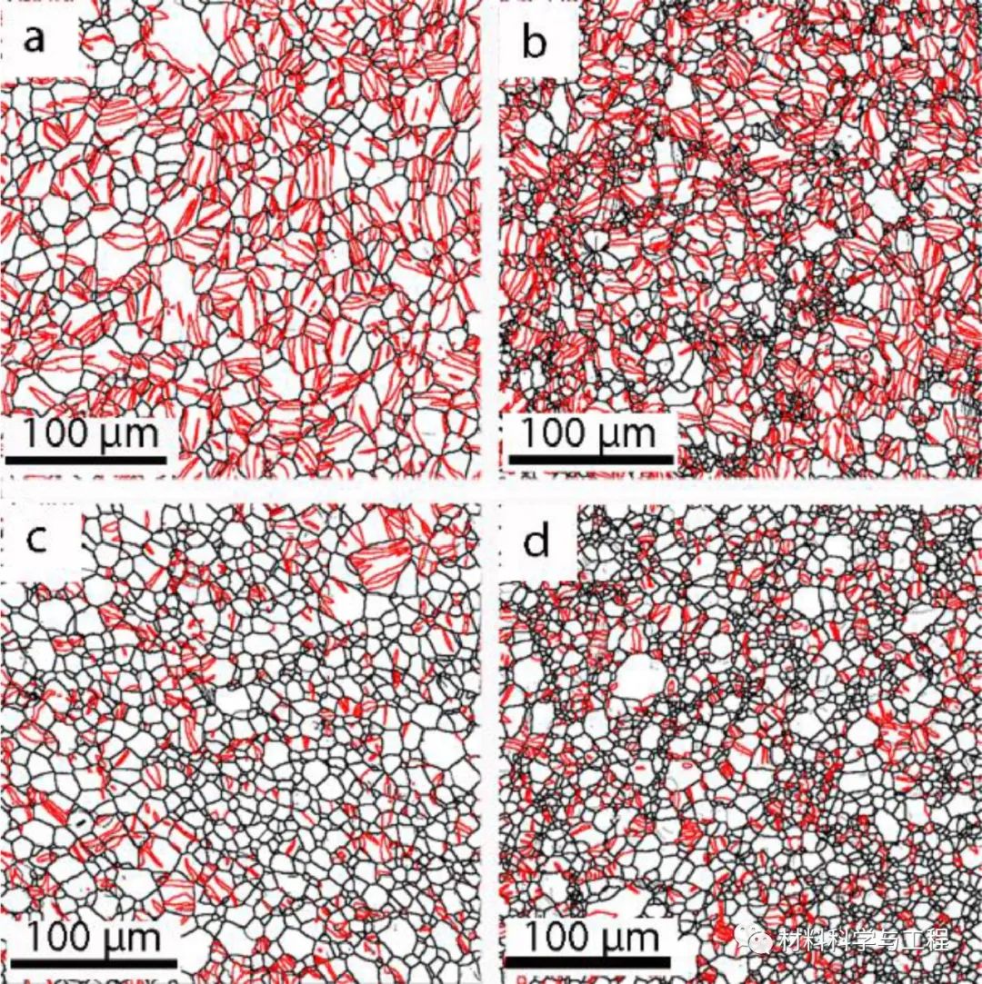 四种合金之间主要变形模式之间的差异是否与Hall-Petch中的k值差异有关呢?已有研究表明,基面滑移主要变形的k (155 MPa·μm1/2)远低于{10-12}孪晶k(223 MPa·μm1/2),因此,较高比例的基底面滑移激活会降低k值。此外,激活较高比例的基面滑移将导致其与孪晶之间更强的相互作用。基面滑移的激活可以有效地触发晶粒内或相邻晶粒的形成孪晶。一般情况下,当基面位错滑到孪晶界时,基面位错会解离为孪生位错和残余位错。随着基面位错和解离的不断进行,其在晶界处的堆积将有效地促进该晶内或相邻晶内孪晶的形核。因此,晶粒中的基面滑移能够促进晶粒相邻孪晶变形。即同一晶粒内基面滑移容易的变形传递到相邻晶粒内{10-12}孪晶,因此k值较低。