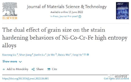 相关研究成果以题“The dual effect of grain size on the strain hardening behaviors of Ni-Co-Cr-Fe high entropy alloys”发表在国际著名材料期刊Journal of Materials Science & Technology上。