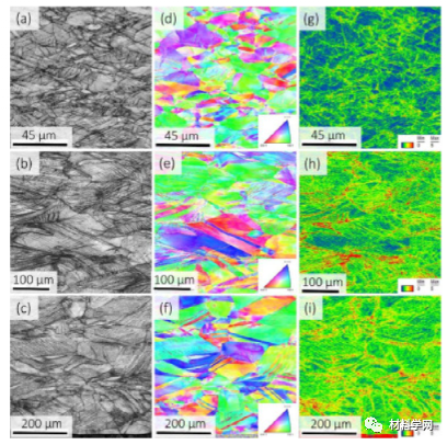 图 5。EBSD 分析不同晶粒尺寸的 NiCoCrFe HEA 在 50% 应变下的变形机制。(a-c) 细粒样品的 IQ 图,(d-f) 小粒样品的逆极图 (IPF) 图,和 (g-i) 大粒样品的 KAM 图