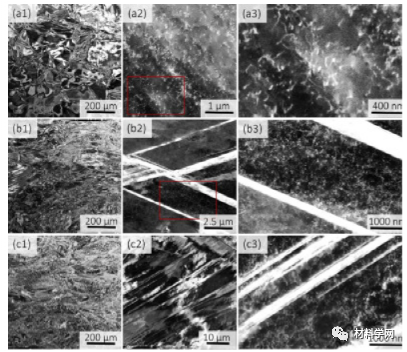 图 3。小晶粒 NiCoCrFe 的变形亚结构。(a) ~10% 应变的 ECCI 图像,(b) ~30% 应变的 ECCI 图像,和 (c) ~50% 应变的 ECCI 图像。