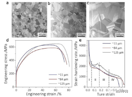 图 1。不同晶粒尺寸 NiCoCrFe 的显微组织和拉伸性能。(a-c) 晶粒尺寸为 11、84 和 125 μm 的 NiCoCrFe HEA 的 BSE 图像,(d) NiCoCrFe HEA 的拉伸应力-应变曲线,以及 (e) 曲线的应变硬化率与真实应变图在(d)中