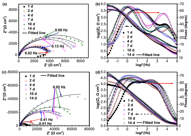 图3 不同龄期腐蚀浸泡试验样品的Nyquist(a,c,e,g)和Bode图(b,d,f,h):(a, b)无生物控制组; (c, d) 107 cells/mL; (e, f) 105 cells/mL; (g, h) 103 cells/mL ? Elsevier