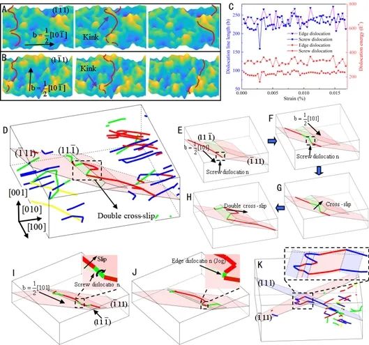 研究人员进一步通过统计分析原子尺度晶格应变,阐明了高熵合金非均匀晶格应变的分形特性,利用随机场理论将非均匀晶格应变场嵌入连续介质模型中,开发了非均匀晶格应变依赖的三维离散位错动力学方法,发现了非均匀晶格应变导致多重扭折/割阶和多向多重交滑移的不寻常位错行为,为探明高熵合金高强韧的起源提供了新的视角。