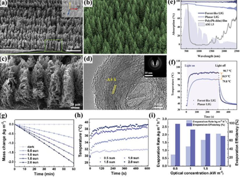 激光加工参数可控、路径可调等特点可进一步赋予了功能碳材料多样性设计制备的优势。受自然界中具有极高太阳光利用效率的针叶森林结构启发,团队通过碳材料多级结构调控,成功构建了一种由多孔石墨烯“树”密排列成的三维石墨烯薄膜(Forest-like LIG,图3)。这种独特的多级结构使得入射光在“树”之间以及“树枝”之间进行多次反射,显著减小了石墨烯的光反射。结合石墨烯本身的光热特性,Forest-like LIG在太阳光全波长范围内具有高达99.0%的光吸收率以及优异的光热转换性能(在一个太阳光强度的氙灯照射下平衡温度达到90.7 ± 0.4 ℃)。同时因为Forest-like LIG独特的化学性质及表面微纳结构,材料表现出超疏水性能。基于这两种特性,团队开发出具有快速驱动响应和高运动速度的光热驱动器以及具有持久抗盐性能和高太阳能蒸发效率的双层太阳能界面海水淡化膜,揭示了Forest-like LIG在光热领域巨大的应用潜力(ACS Nano, 2021, 15, 12, 19490-19502)。