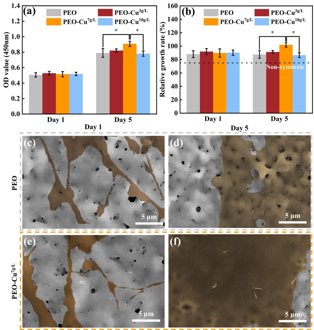 图2. CuxO/TiO2膜层表面细胞毒性试验及细胞形态:(a) 光密度值;(b) 相对增长率;(c) 培养1天后的PEO膜层,(d)培养5天后的PEO膜层,(e)培养1天后的PEO-Cu7g/L膜层和(f) 培养5天后的PEO-Cu7g/L膜层的成骨样细胞MG-63形态。