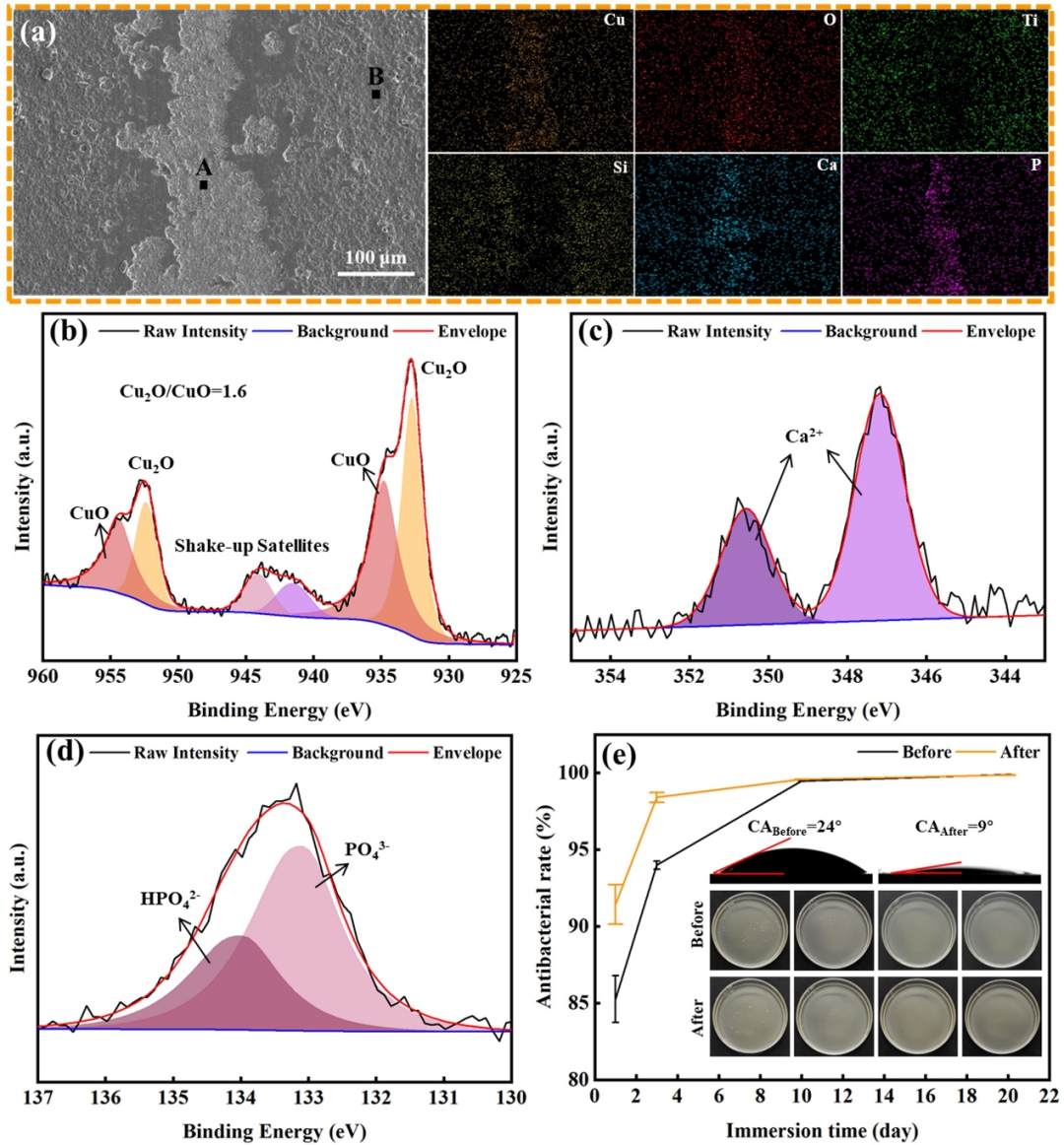 图4. 腐蚀磨损后PEO-Cu7g/L磨损表面分析及抑菌效果表征:(a) 磨损表面元素分布;(b) Cu 2p、(c) Ca 2p和(d) P 2p的元素价态分析;(e) PEO-Cu7g/L膜层在腐蚀磨损试验前后的接触角和抑菌率演变。
