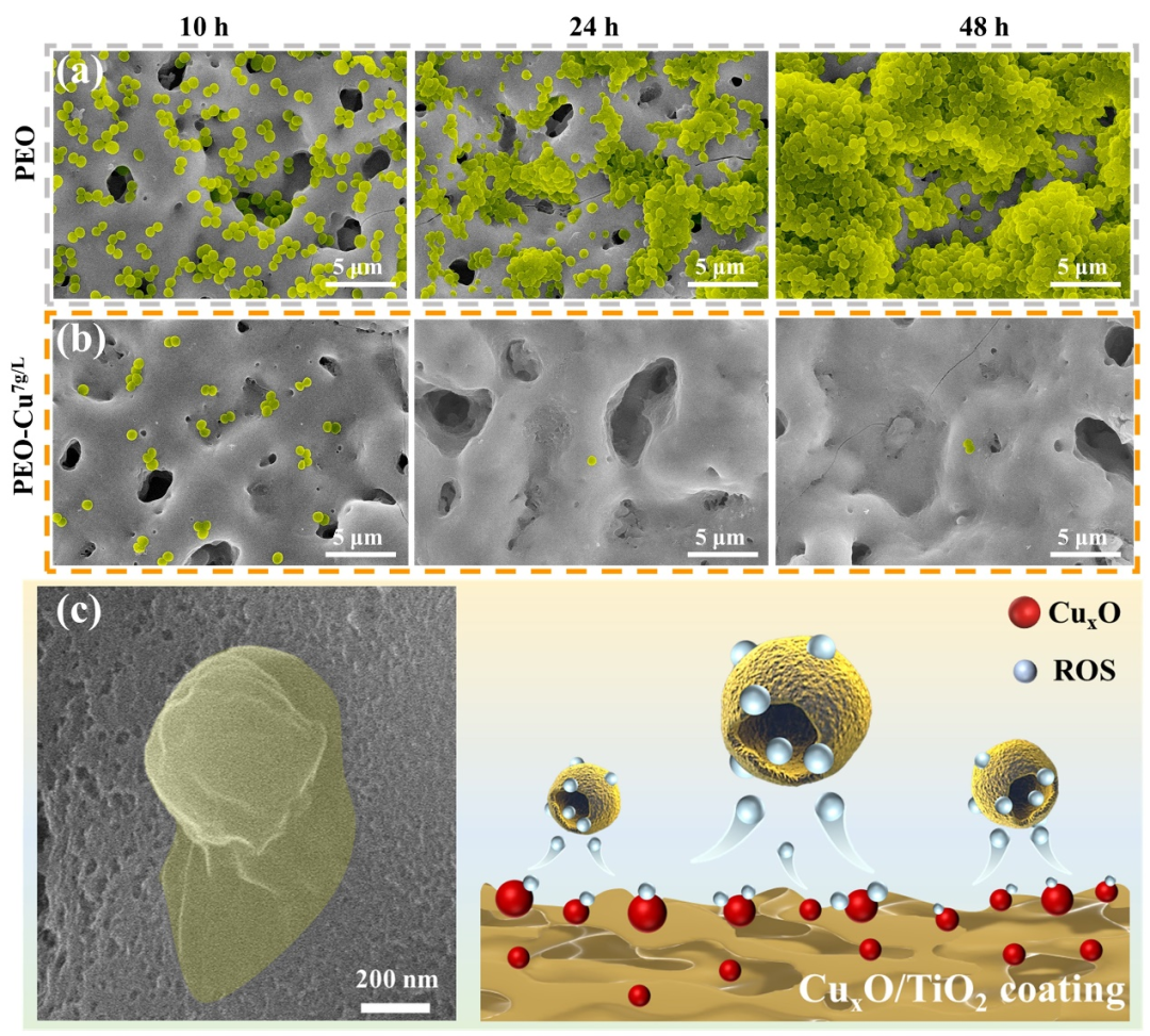 图3. 培养10 h、24 h、48 h后表面S. aureus细菌形态及抑菌机制示意图:(a) PEO膜层;(b) PEO-Cu7g/L膜层;(c) 接触抑菌示意图(左图为细菌膜破裂)。