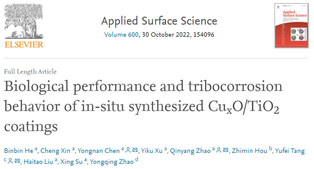 近日,来自长安大学陈永楠教授团队与西安理工大学汤玉斐教授团队联合原位设计了CuxO/TiO2生物抑菌膜层并研究了生物性能和腐蚀磨损行为之间的协同效应。通过等离子体电解氧化(PEO)方法在钛合金表面原位引入抑菌剂CuO和Cu2O,有效提高材料的耐蚀、耐磨、生物相容性以及抑菌性能。膜层表面分布的CuxO呈现无毒性并对金黄色葡萄球菌具有良好的抑菌性能和长期抗菌性,同时兼具较好的减摩性。研究结果对抑菌抗菌膜层的设计和制备提供了理论依据,CuxO原位制备技术的发展有望为植入钛合金抑菌耐腐蚀磨损膜层的应用提供更多的机会。相关论文以题为“Biological performance and tribocorrosion behavior of in-situ synthesized CuxO/TiO2 coatings”发表在Applied Surface Science期刊上。论文第一作者为长安大学硕士研究生何斌斌和辛程,通讯作者为长安大学陈永楠教授和赵秦阳博士及西安理工大学汤玉斐教授,合作者还包括长安大学徐义库教授、西北有色金属研究院的赵永庆教授和西部钛业有限责任公司的侯智敏教授等。