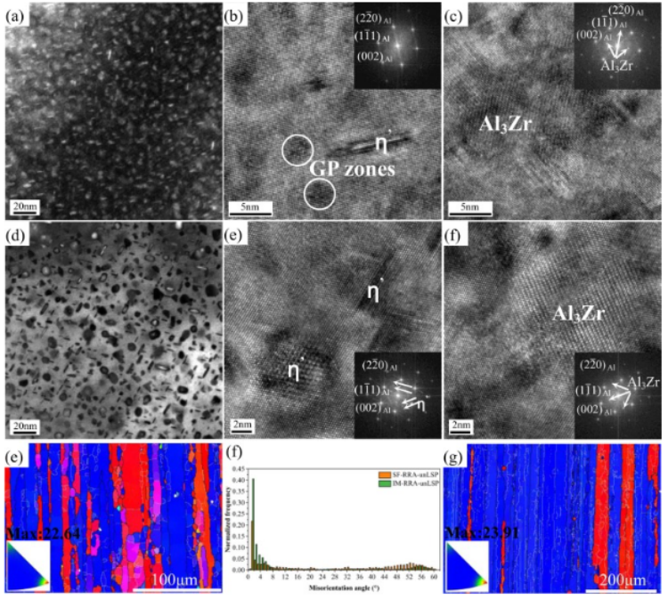 图 14。未经 LSP 处理的研究合金的显微组织:(a)-(c) SF-SA 样品的 TEM 和 HRTEM 图像;(d)-(f) SF-RRA 样品的 TEM 和 HRTEM 图像;(e) 和 (g) 分别为 SF-RRA 和 IM-RRA 样本的 IPF 图像和反极图;(f) (e) 和 (g) 的方向错误角分布。