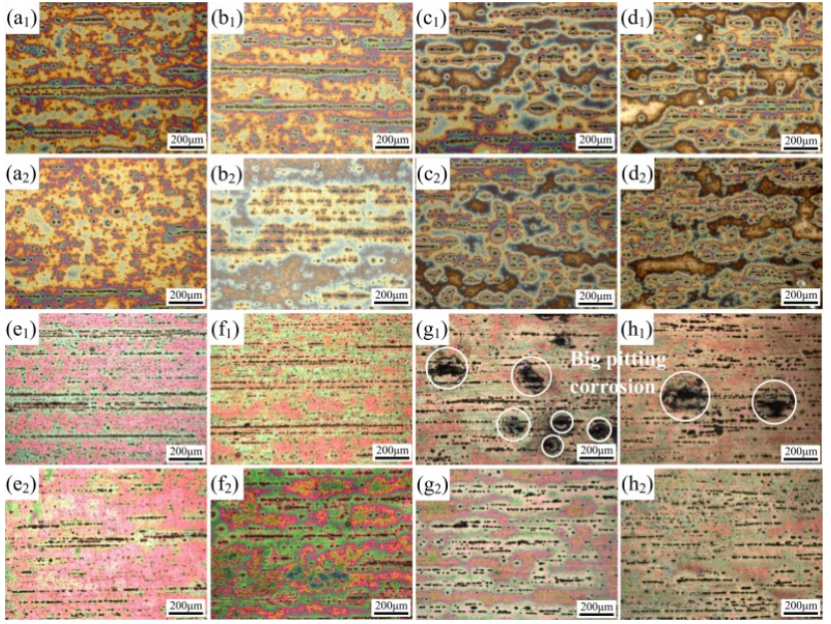 图3 . 在 3.5% NaCl 溶液中浸泡 24 h 后的腐蚀坑深度:(a) SF-SA-unLSP;(b) SF-SA-LSP;(c) SF-RRA-unLSP;(d) SF-RRA-LSP;(e) IM-SA-unLSP;(f) IM-SA-LSP;(g) IM-RRA-unLSP;(h) IM-RRA-LSP。