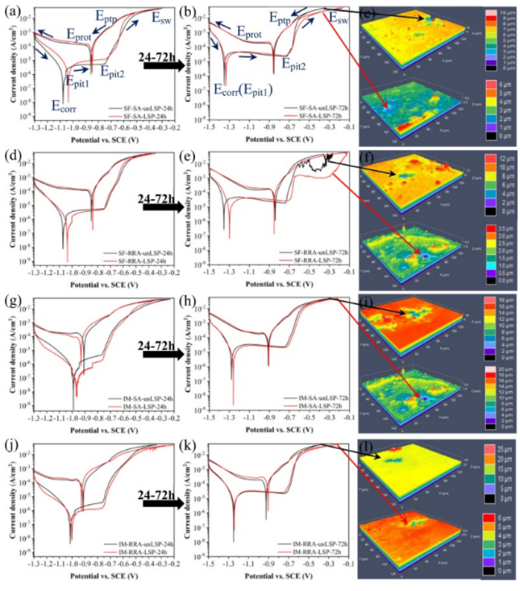 图 11。试验后研究合金的循环极化曲线和表面形貌:(a)-(c)SF-A样品24、72小时和(b)中样品的相应表面形貌;(d)-(f) SF-RRA 样品 24、72 小时和 (e) 中样品的相应表面形态;(g)-(i) SF-SA 样品 24、72 小时和 (h) 中样品的相应表面形态;(j)-(l) SF-SA 样品 24、72 小时和 (k) 中样品的相应表面形态。