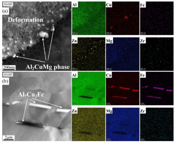 图 18。SF-RRA-LSP合金中第二相的HAADF-STEM图像和EDS结果:(a)Al 2 CuMg相;(b) Al 7 Cu 2 Fe 相。