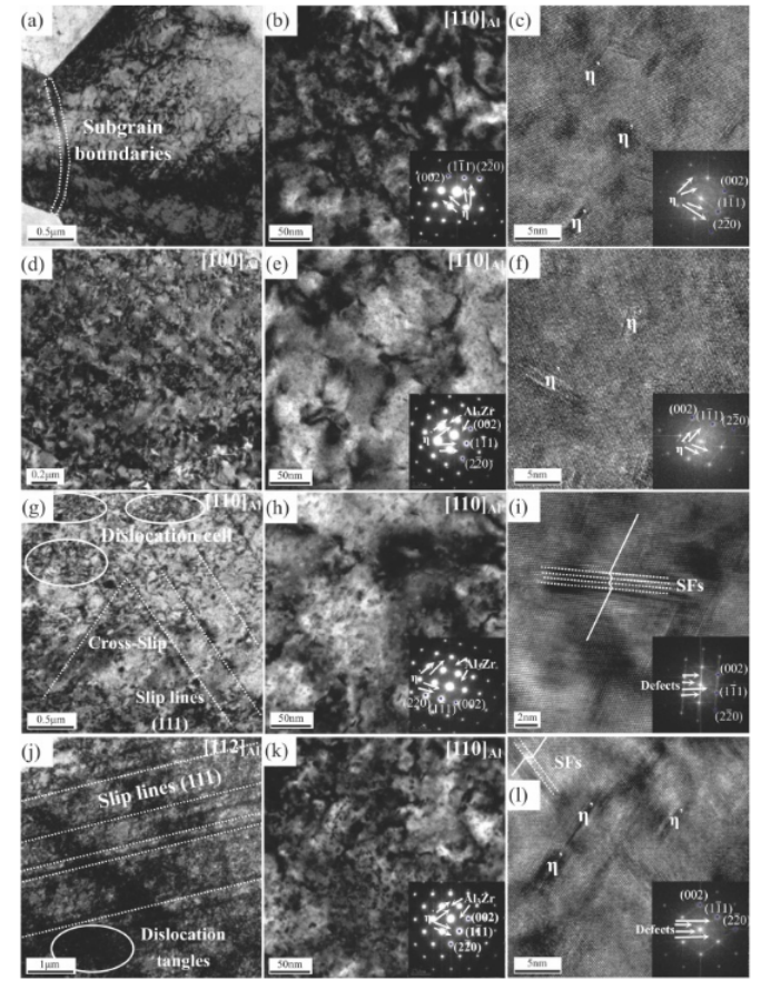 图 17。LSP 处理后研究合金的明场、SAED 和 HRTEM 图像:(a)-(c) SF-SA-LSP 样品;(d)-(f) IM-SA-LSP 样本;(g)-(i) SF-RRA-LSP 样品;(j)-(l) IM-RRA-LSP 样本。