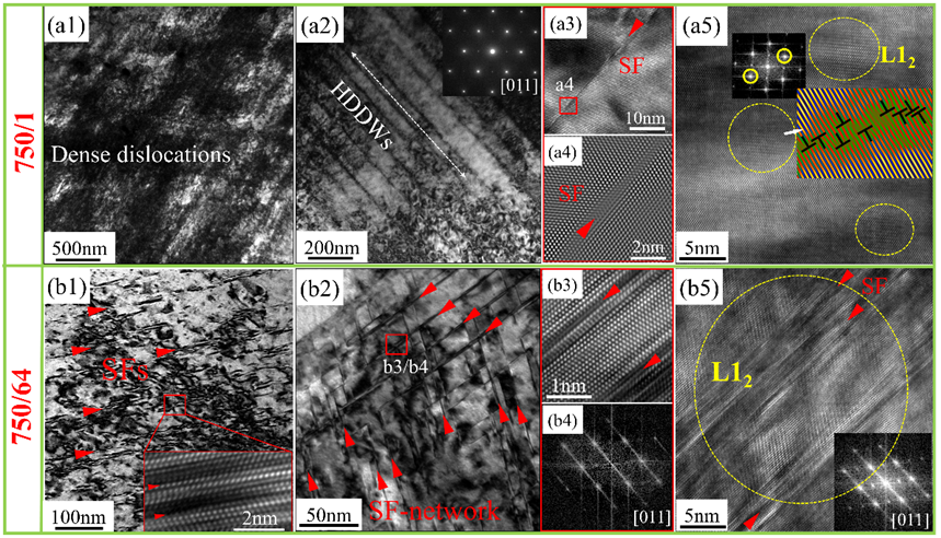 图 5.(a1-a5)750 °C时效1h后变形组织:高密度位错、高密度位错墙、少量层错和位错切过小尺寸颗粒特征;(b1-b5)750 °C时效64h后变形组织:纳米尺度层错和层错网络、高分辨层错和层错穿过大尺寸纳米颗粒。