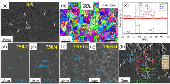 图 1. (NiCoCr)92Al6Ta2合金再结晶态与750 °C时效不同时间后的微观组织。时效诱发微米尺度富Cr的σ相逐渐沿晶界析出。