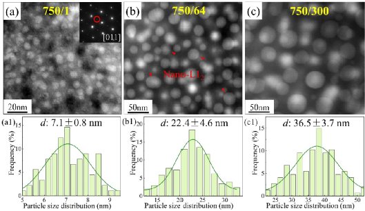 此外,鉴于纳米相的显著强化效果,研究者大多关注强化机制的纳米相尺寸效应,比如当纳米相尺寸较小并与基体共格时为切过机制,而当颗粒尺寸超过临界值或非共格时为绕过机制。然而,对于纳米相如何影响高熵合金的变形机制却鲜有报道。针对上述几个问题,该研究系统研究了1)纳米共格相的强韧化效应;2)材料变形机制的纳米相特征依赖性;3)纳米相的粗化动力学行为,并进一步揭示了其内在机理。该研究成果日前以“A strong and ductile NiCoCr-based medium-entropy alloy strengthened by coherent nanoparticles with superb thermal-stability”为题发表在金属材料领域权威期刊JMST上。