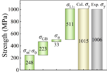 (1) 强化机制理论计算表明纳米共格相贡献了最大的强化效果,并与其他强化机制的协同效应使合金具有高强度(YS~1.0GPa,UTS~1.5GPa)的同时依然保持较高的塑性(~20%);