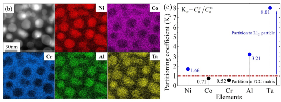 图 3. (a)FCC/L12共格界面原子尺度表征;(b)纳米颗粒元素分布特征;(c)基体和纳米相的元素配分行为。