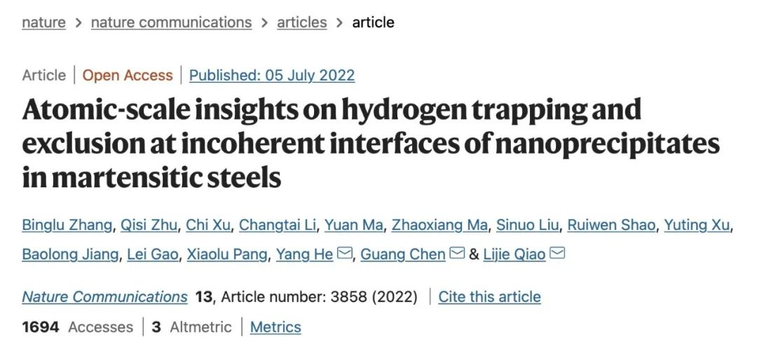 近日,《Nature Communications》以“Atomic-scale insights on hydrogen trapping and exclusion at incoherent interfaces of nanoprecipitates in martensitic steels”为题在线发表了我校材料基因工程高精尖创新中心乔利杰教授团队和南京理工大学材料科学与工程学院/格莱特研究院陈光院士团队的最新合作成果。该研究发现并非所有的纳米析出相都能捕获氢,析出相与基体界面上的碳/硫空位和弹性拉应变场可能决定了界面的氢捕获行为。该成果为探究纳米尺度特征的氢捕获行为和微观机理提供了一种有效的实验方法,为利用纳米相析出相兼得强化和抗氢效果奠定了一定基础。