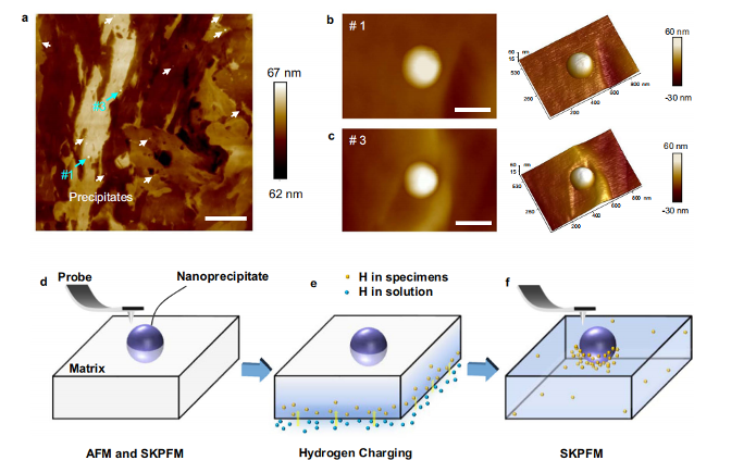 图1. 马氏体钢中纳米析出相的原子力显微镜形貌图和扫描开尔文探针力显微镜实验过程示意图