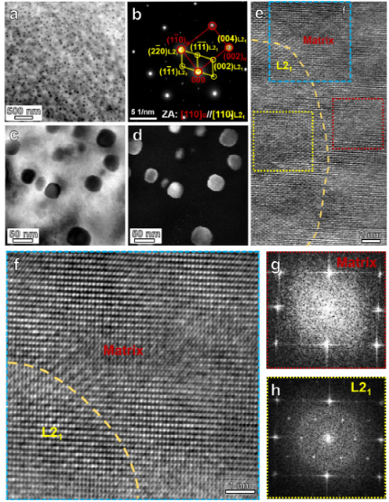 图 3。(a) 铸态合金样品的高角环形暗场 (HAADF) 扫描 TEM (STEM) 图像。(b) 选区电子衍射 (SAED) 图案。(cd) 分散的纳米沉淀物的明场 (BF) TEM 图像和相应的暗场 (DF) TEM 图像。(ef) 高分辨率 TEM (HRTEM) 图像显示纳米沉淀物和基质之间的相界面。从 BCC-α 矩阵和 L2 1纳米沉淀物获得的快速傅里叶变换 (FFT) 模式。