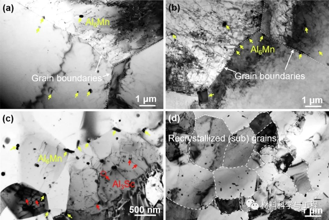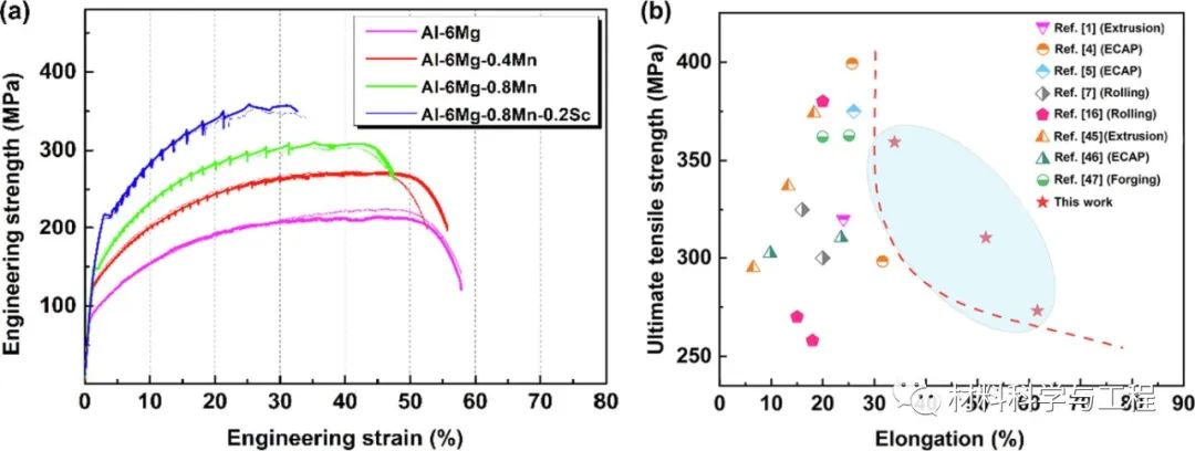 综上所述,Mn和/或Sc合金化提供了固溶强化、晶界强化和第二相强化以提高强度。引入的纳米Mn和Sc相对位错和晶界有很强的钉扎作用,从而产生位错强化效应。其次,大的挤压比有利于高的动态再结晶驱动力,从而导致高的再结晶率和塑性增强。Mg元素在基体中均匀分布和较大挤压比使粗的二次相断裂细化,进一步提高了合金的延性。