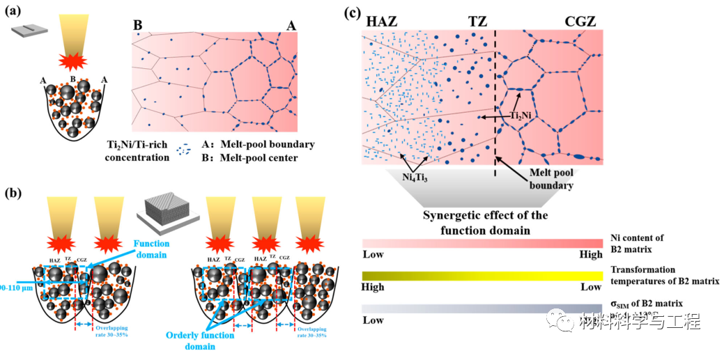 从物理冶金学过程上来说,选区激光熔化(Selective laser melting,SLM)增材制造技术是一个有序的构建过程,其中金属粉末颗粒快速熔化,随后逐道次、逐层凝固获得具有特定设计构型的金属构件。这些有序熔池和循环热历史的存在通常会导致在两个相邻熔池之间形成三个特征区:热影响区(Heat-affected zone, HAZ)、过渡区(Transition zone, TZ)和细小胞状晶区(Cellular-grain zone, CGZ)。这三个区域构成了组成基体的一个基本单元,本文将其定义为功能基元。