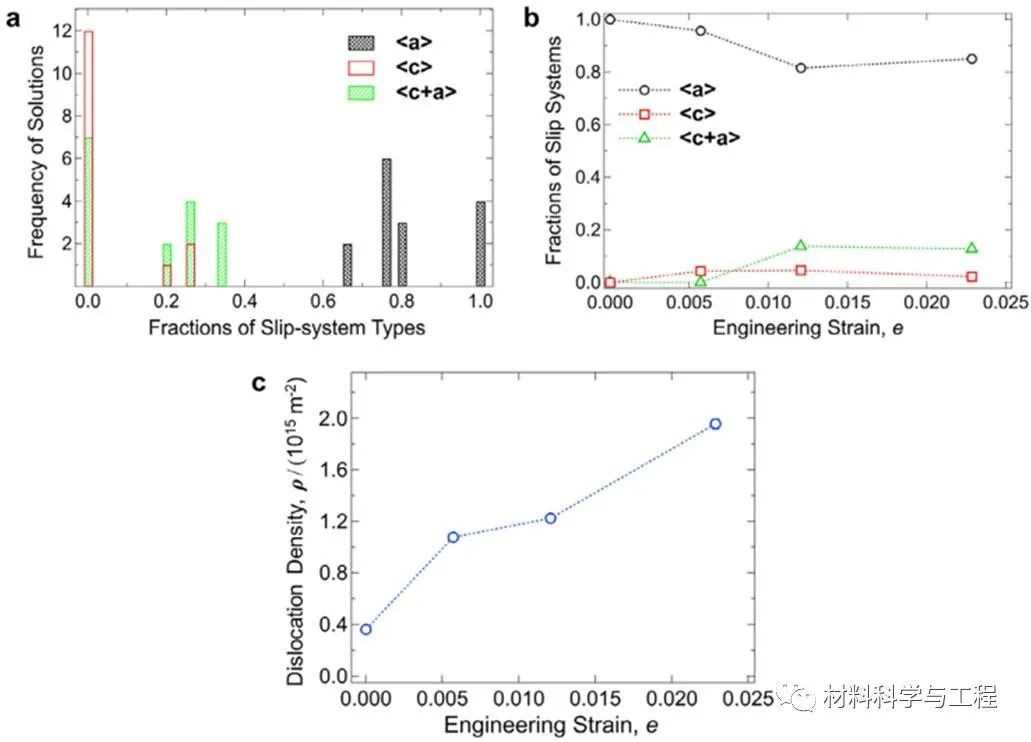图5. 超细晶纯镁样品在液氮温度下拉伸变形过程中的位错密度变化。除了常规的<a>位错,大量柏氏矢量为<c>和<c+a>的位错被激活。