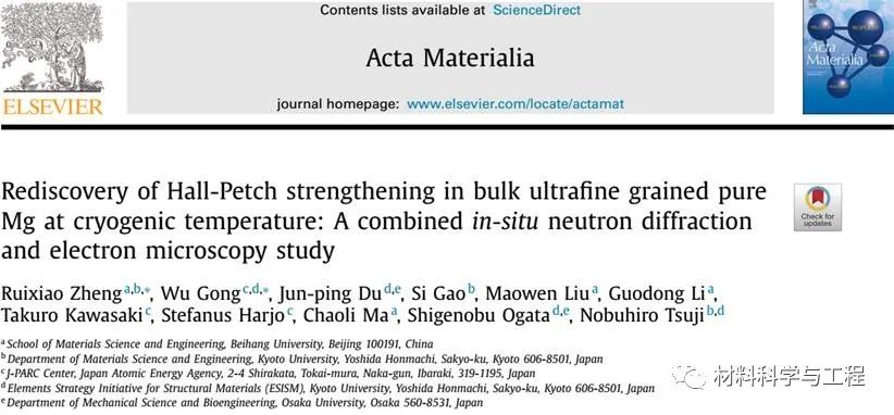 为了进一步澄清超细晶纯镁的塑性变形行为,来自北京航空航天大学、日本原子能研究机构、京都大学和大阪大学的研究人员利用先进的原位中子衍射和电子显微分析技术,系统研究了块体超细晶纯镁在室温和液氮温度下的准静态拉伸变形行为。相关论文以“Rediscovery of Hall-Petch strengthening in bulk ultrafine grained pure Mg at cryogenic temperature: A combined in-situ neutron diffraction and electron microscopy study”为题发表在金属材料领域顶级期刊Acta Materialia上。北京航空航天大学材料科学与工程学院的郑瑞晓副教授是论文的第一作者兼通讯作者,日本原子能研究机构的龚武博士为论文的共同通讯作者。
