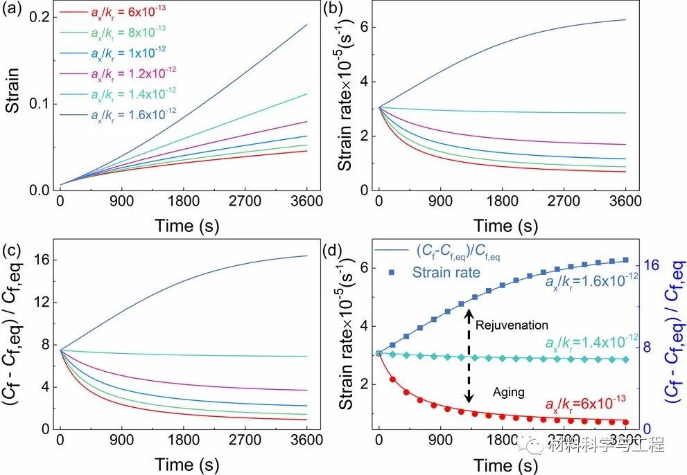 图4. 不同缺陷再生与湮灭竞争强度下蠕变过程中a)应变; b)应变速率; c)缺陷浓度的演化; d) 蠕变过程中应变速率与缺陷浓度之间的一一对应关系。