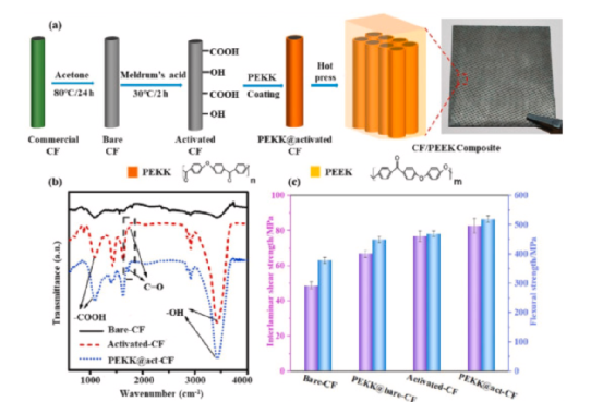 图5 所示为CF/PEEK复合材料用PEKK施胶剂:(a)施胶CF表面示意图;(b) CF表面的 FTIR 光谱;(c)层间剪切强度和弯曲强度。