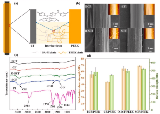 图4所示为CF/PEEK复合材料用PI施胶剂:(a)施胶CF表面示意图;(b) CF 表面的微观形貌;(c) CF表面的 FTIR 光谱;(c) 层间剪切强度和弯曲强度。