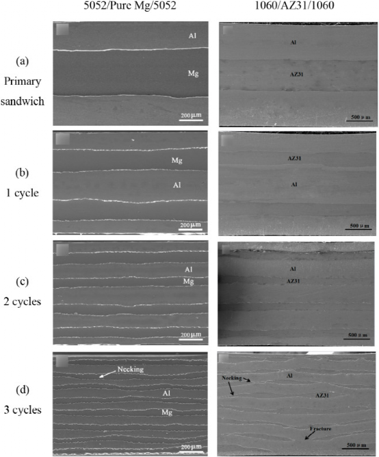 ARB 键合也被用于制备多层 Mg/Al LMCs。在以往的研究中,微观结构和宏观结构的演变在 ARB 键合过程中进行了研究。ARB循环的增加将导致Mg层和Al层之间应变分配的变化,硬质层的颈缩和断裂,以及界面处IMCs的形成和破碎。这些结构的演变对 ARBed Mg/Al LMCs 的整体力学性能有重要影响。然而,关于力学性能与ARBed结构之间关系的研究很少受到关注。随着 ARB 循环次数的增加,Mg/Al LMCs 的强度和延展性会降低。这与 ARBed 整体式铝合金或整体式镁合金有很大不同。作为一种严苛的塑性加工工艺,采用高循环 ARB 可以获得超细晶粒。