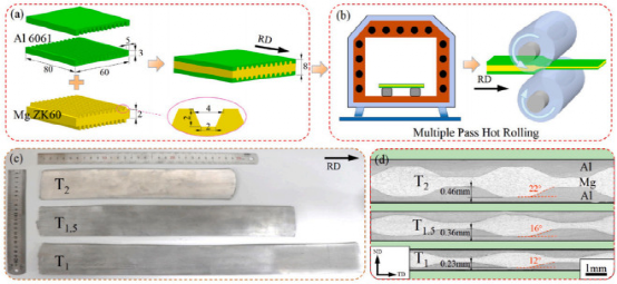 图27 (a)和(b)制备含梯形中间层Al/Mg/Al的示意图,(c) RD-TD平面宏观形貌,(d) TD-ND平面宏观形貌