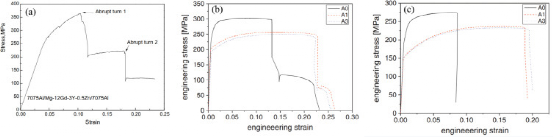 图34 (a) 7075/Mg-Gd-Y-Zr/7075 LMC的典型应力-应变曲线,(b) STS430/3004/AZ31 LMC , (c) AZ31的典型应力-应变曲线