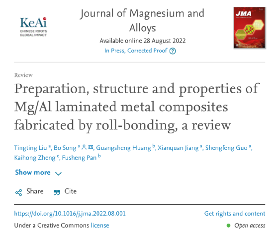 对此,重庆大学潘复生院士团队进行了深入研究。本篇综述详细阐述了轧制参数和后续退火对Mg/Al LMC界面结构的影响。还总结了一些特殊轧制技术在镁/铝LMC制备中的应用。综述了Mg/Al LMC界面结构与力学性能之间关系的最新研究结果成果。最后,提出了该领域的进一步研究方向。项关于研究成果以题为Preparation, structure and properties of Mg/Al laminated metal composites fabricated by roll-bonding, a review发表在Journal of Magnesium and Alloys上。