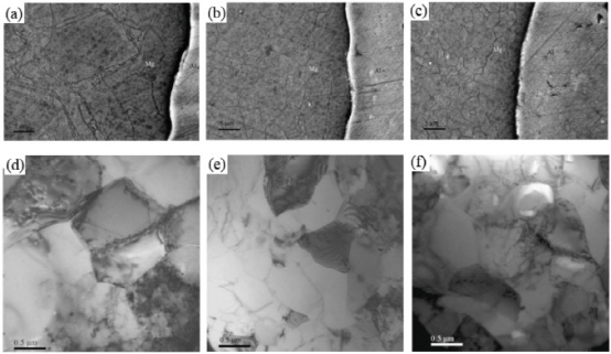 图4 (a) 20%, (b) 40%, (c) 50%还原率下AZ31/1060/AZ31 LMC的SEM显微图。退火后1060Al的TEM图像:在(d) 20%, (e) 40%, (f) 50%还原率下,Mg/Al/Mg LMC中的Al层