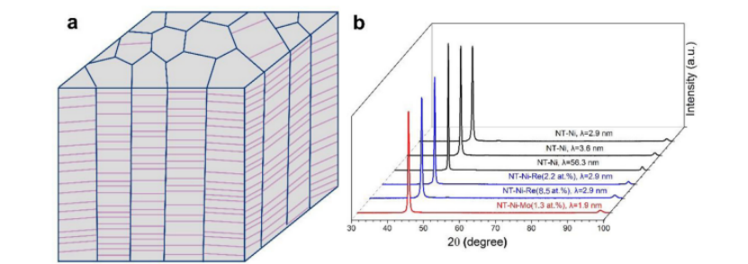图1 (a)柱状纳米孪晶结构示意图和(b)电沉积Ni和微合金化Ni样品的XRD图谱。