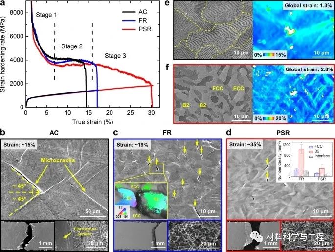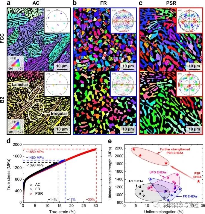 在此,研究结果表明,相选择再结晶(PSR),可以充分利用共晶中两相的应变硬化能力,从而获得超塑性共晶合金。研究者对共晶高熵合金(EHEA)中两相的应变分配行为进行调控,得到了完全再结晶的软相嵌在硬相骨架中的相选择性再结晶显微组织。由此产生的微观组织消除了弱边界,充分释放了EHEA的应变硬化能力。相选择性再结晶EHEA,在真应力为~ 2 GPa的情况下,获得了~ 35%的高延性均匀伸长率。这一概念适用于各种具有软硬相的双相合金,为传统共晶合金作为高强度金属材料开辟了新领域。