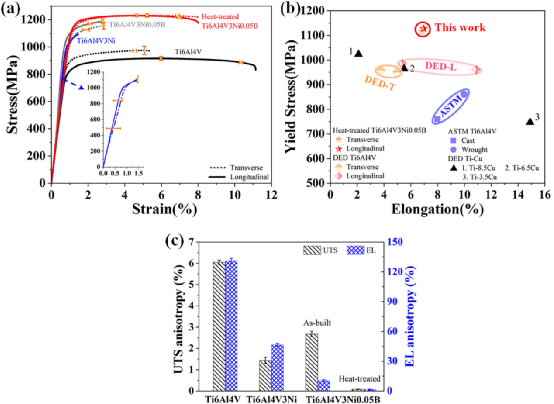 图4 Ti6Al4VxNiyB合金的力学性能。(a)代表性的工程应力-应变曲线;误差棒(UTS和EL)代表一个标准差。(b)通过DED和Ti6Al4V的ASTM标准,热处理后的Ti6Al4V3Ni0.05B的拉伸性能与Ti-Cu和Ti6Al4V相当。(c)各向异性。