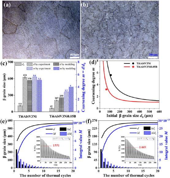 图2 位于Ti6Al4V3NiyB矿床中间的β-晶粒。(a)Ti6Al4V3Ni, (b)Ti6Al4V3Ni0.05B;(c)β-晶粒尺寸和粗化度m;(d)模拟m对d0的函数,符号代表实验值;(e)Ti6Al4V3Ni和(f)Ti6Al4V3Ni0.05B中模拟δdi,d=d0+δdi,δMi和M=δMi对热循环数(Tβ<t< span="">p<t< span="">s)。(Ts和Tβ是用Thermo-Calc计算的)。</t<></t<><t< span=""><t< span=""></t<></t<>