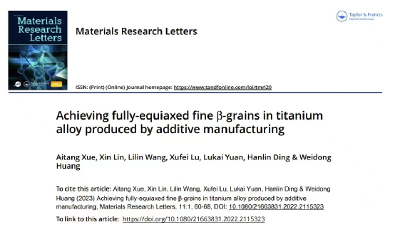 相关研究成果以题“Achieving fully-equiaxed fine β-grains in titanium alloy produced by additive manufacturing”发表在国际著名期刊Materials Research Letters上。
