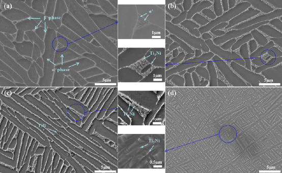 图3 Ti6Al4VxNiyB沉积物中间的微观结构。原状:(a)Ti6Al4V,(b)Ti6Al4V3Ni,和(c)Ti6Al4V3Ni0.05B,(d)热处理的Ti6Al4V3Ni0.05B。