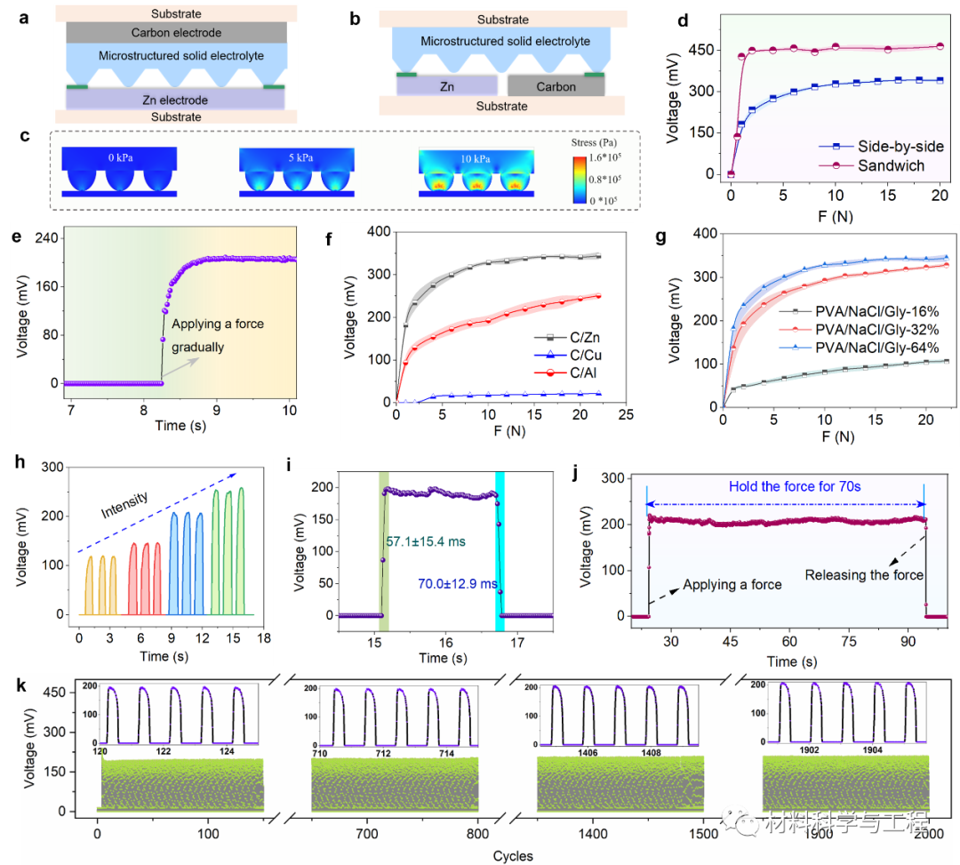 图3. 柔性电化学力学传感器的响应行为和性能表征。