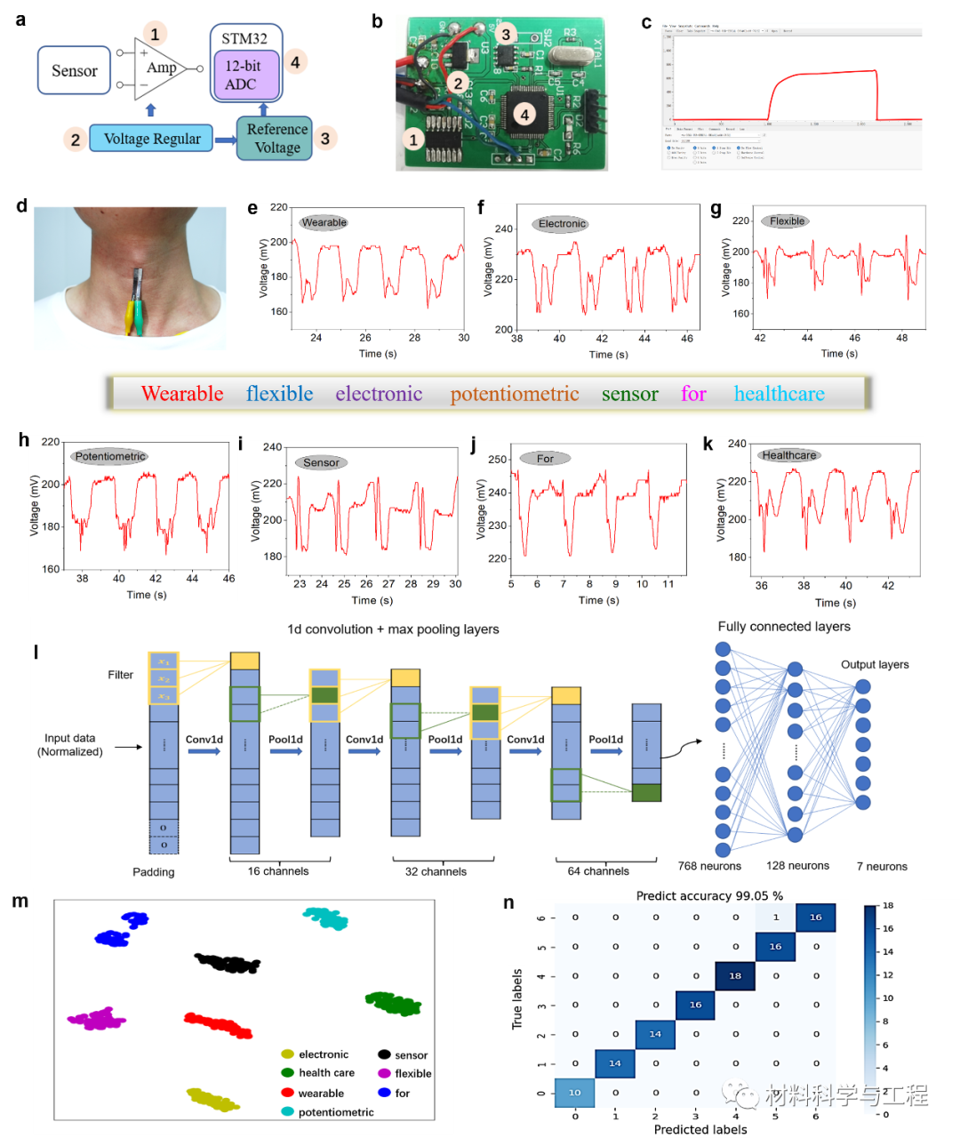 图4. 所研发柔性电化学力学传感器在结合机器学习进行语音识别方面的应用探索。