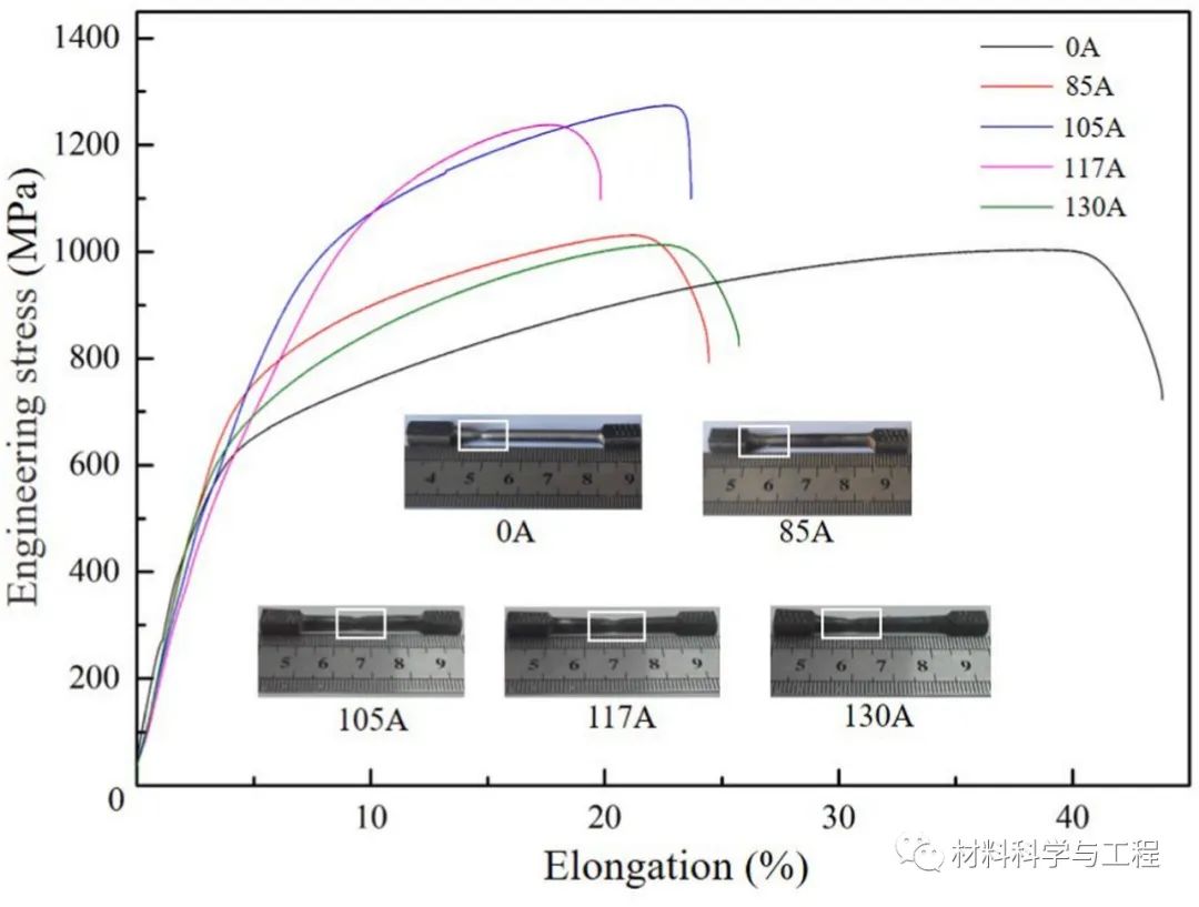 拉伸结果表明,屈服应力先随电流的增大而增大,达到最高值后随电流增大而减小,电流处理后试样表现出更低的延展性,电流在105A以下时,第二相强化是主要强化机制,δ相数量增加导致强度提升,电流大于105A时,位错密度下降,由于焦耳热效应导致材料出现一定程度软化,减少了位错与δ相之间的相互作用。